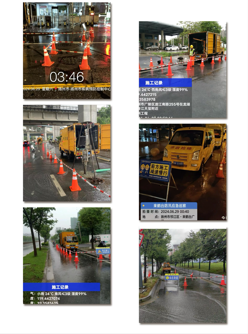 其中,邗江北路与文昌路交叉口(来鹤台)和邗江北路海德公园门口两处责任积水点安排专人和应急车辆前置值守。对管辖范围内江平路和扬子江北路交叉口、江平路和润扬北路交叉口、渡江南路、上方寺路、扬州天下、苏北医院西门、大官桥路、朱塘路等易满溢点进行全天候不间断巡查。