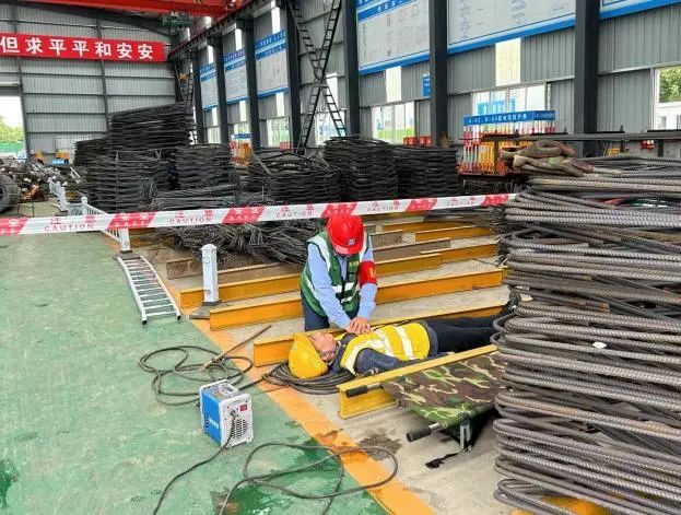 此次演练分为基坑坍塌视频培训、高温中暑桌面演练、触电救援实操演练三个环节进行。其中,实操演练模拟拖地电线造成一名钢筋工触电。现场指挥、警戒疏散、医疗救护、事故调查、通讯联络等工作小组按照应急救援方案快速响应,依次有序开展救援工作。