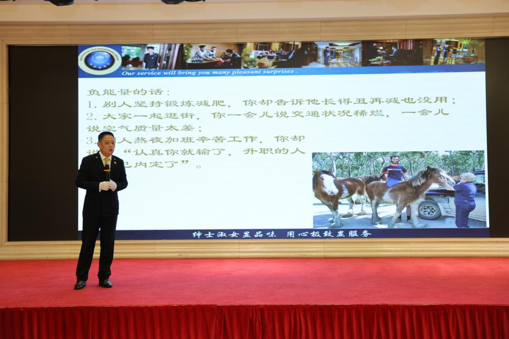 此次培训邀请中国金管家服务创始人陆飞老师进行授课。他首先分享了与长乐客栈酒店风格类似的苏州等地知名酒店的成功运营模式。随后,重点围绕“如何提升服务质量”和“如何打造特色餐饮服务”两方面,通过案例分析、现场问答等方式,对酒店服务意识提升、酒店形象塑造、服务沟通技巧、餐饮摆台设计和出品设计等内容进行了深入浅出的讲解。