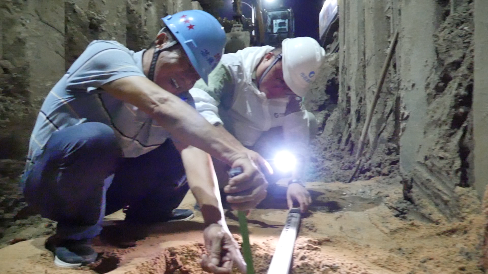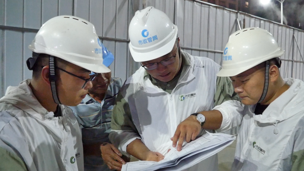 凌晨两点,城市进入梦乡,只剩蛙叫蝉鸣。邗江北路积水点施工现场依然一片火热,管网运营二所熊永祺与工程建设处储智毅、张和鹏三人正在讨论着施工图纸。为保证工程进度,市政管网公司采取“干两头、歇中间”的工作方法,避开中午高温,夜间多赶工,保质量,抢工期。工程建设处张和鹏介绍,今年,我市已经启动了一系列针对城市易涝积水点的综合整治工作,管网公司亦积极投身其中,改造并优化相关积水点的管网系统与沟渠设施,从根本上解决积水问题。