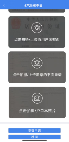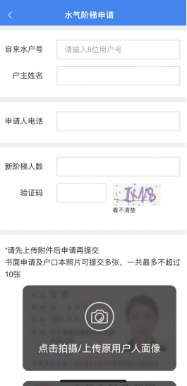 05填写业务办理信息根据自身情况填写“自来水/燃气户号”、“户主姓名”、“申请人电话”、“新阶梯人数”,上传身份证正反面照片(必须项),若户口本人口数与新阶梯人数一致,上传户口本照片即可提交申请。(若不一致,还需在申请说明页面下载“证明模板”填写并盖章后上传,照片最多上传10张哦~)