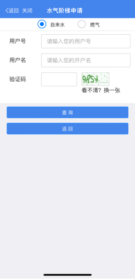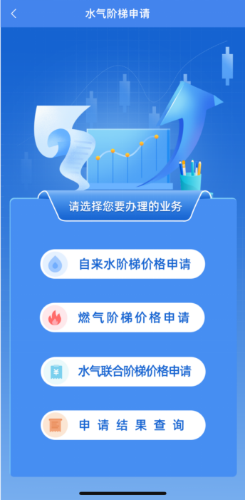 03选择申请办理业务进入“水气阶梯申请”,根据自身需要办理的业务点击相应的按钮,若自来水和燃气均需申请,点击“水气联合阶梯价格申请”。