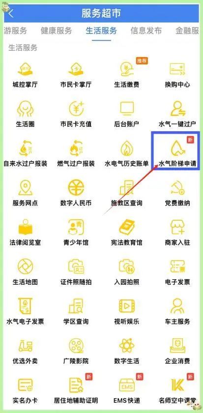 02进入水气阶梯申请页面打开我的扬州APP,点击“功能栏”的更多,进入“服务超市—生活服务”,找到“水气阶梯申请”。