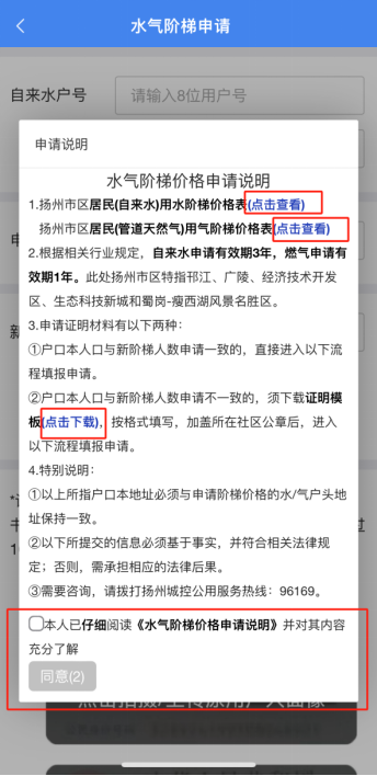 04查看申请说明浏览申请说明的各事项,查看阶梯价格表、可办理地区、所需材料等内容,勾选知晓和同意按钮后,进入业务办理界面。