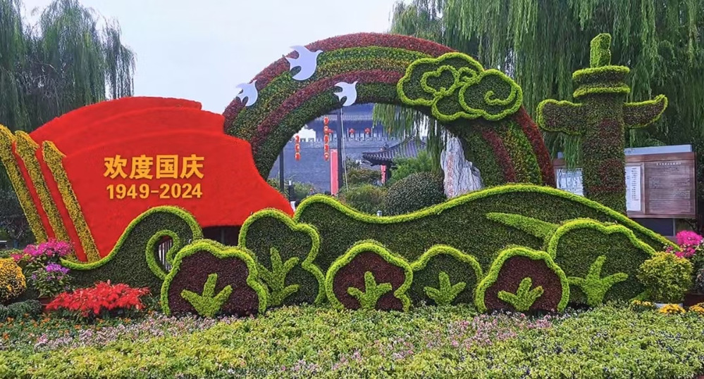 主游路沿线上东关街巷打卡墙处花坛,打造的“祖国繁荣”绿雕景观让人眼前一亮,郁郁葱葱的景框与翠绿的枝叶相映成趣,各色花卉构成了一幅靓丽的风景线,通过造型各异的动物园林小品,以灵动的方式向祖国母亲献上最真挚的祝福。国庆节前,新的绿雕打卡地布置工作已经全部完成,提升了东关街景区内的景观品质,为游客营造喜庆热烈的节日氛围。