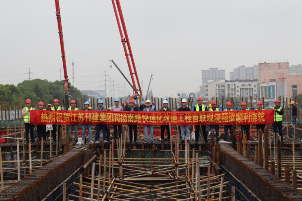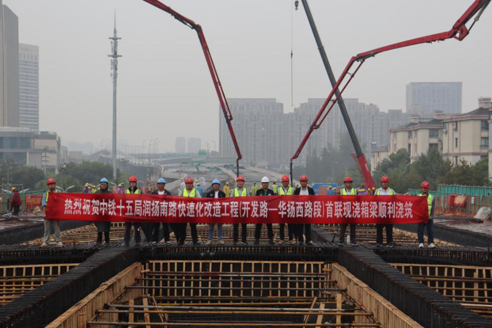 10月14日,继昨日润扬南路快速化改造工程中铁十五局段完成首次箱梁浇筑,历经12小时的连续作业,江苏邗建段也顺利完成了首次箱梁浇筑。