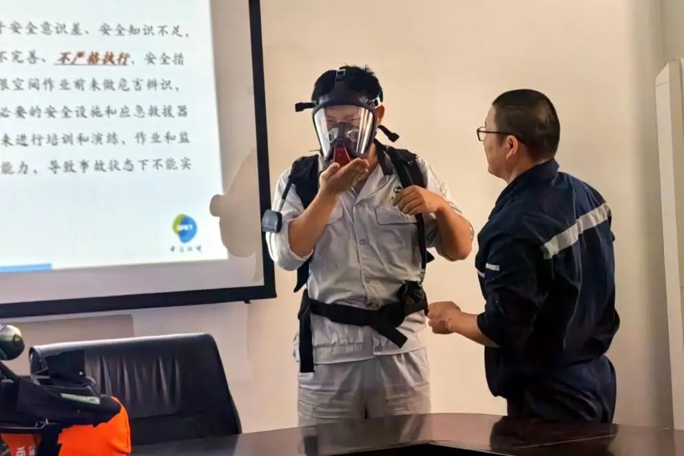 除了理论知识的讲解,培训还增加了安全防护设施的穿戴实操环节,员工们亲身体验了正压式空气呼吸器的穿戴和使用。通过实操学习,员工们不仅掌握了正确的穿戴方法,还深刻体会到了安全防护设施在保障人身安全方面的重要作用。