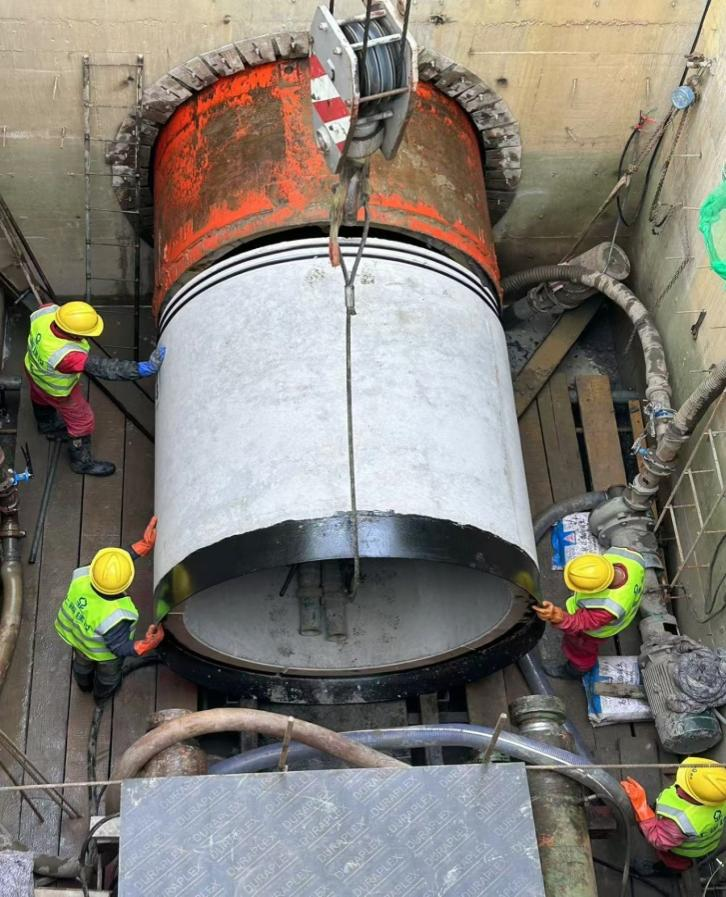 为保证顶管施工安全及接口衔接质量,在顶管施工作业前,洁源环境公司对顶管施工方案及相关应急预案进行了专项审查,对顶管施工作业过程中可能出现的超挖、卡管及突水突泥等潜在问题进行了预判分析,并提前准备应急处置措施;在全体工作人员多个日夜鏖战下,伴随着工作井内顶管液压油缸有序推进,接收井内密封砖墙洞口被顶管机头缓慢顶通,六圩扩建工程进水总管线首段顶管施工顺利完成。