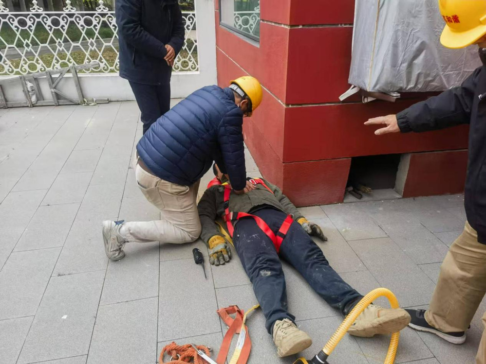 本次演练模拟石油新村供暖小区半通行地沟内供暖管道泄漏,供热公司第三方维保单位1名作业人员进入半通行地沟进行施工,作业人员因长管呼吸器被工具挤压导致窒息晕倒,监护人员同步立即报警并上报事故,随即应急指挥小组立即启动应急预案,组织力量开展有限空间应急救援行动。