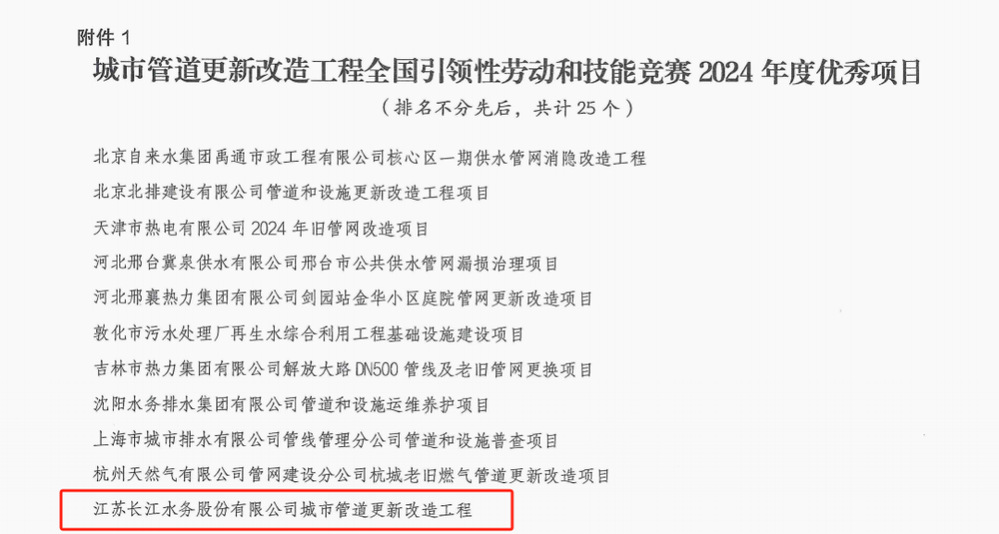 近日,中国海员建设工会全国委员会发文表彰,江苏长江水务股份有限公司老旧小区给水管道及配套设施改造工程荣获城市管道更新改造工程全国引领性劳动和技能竞赛2024年度优秀项目,全省唯一获此殊荣单位。