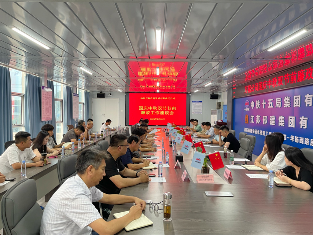 为深入贯彻中央八项规定精神,营造风清气正的节日氛围,严防“八小时外”和“节日病”,9月28日下午,万福公司党支部在润扬路南延项目部开展节前廉政工作座谈会。万福公司领导班子成员、各部门负责人及现场工作人员;中铁十五局、扬建集团、邗建集团、太平洋西北建设集团各项目书记、项目经理和监理单位工作人员参加会议。
