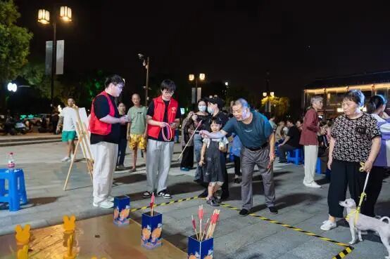 除了文化雅韵,现场设置了多个互动打卡与市集体验区,让节日氛围更添烟火气。“我在徐凝遛月亮”打卡点前,居民手持造型精巧的月亮小夜灯定格温馨瞬间;“玉兔投壶”游戏区排起长队,老少同乐间复刻古代士人的闲情雅趣。“月光市集”汇集文创手作、中秋美食等,市民凭游园卡完成互动、集齐印章,即可兑换月亮小夜灯和冰皮月饼,将节日祝福化作触手可及的温暖。