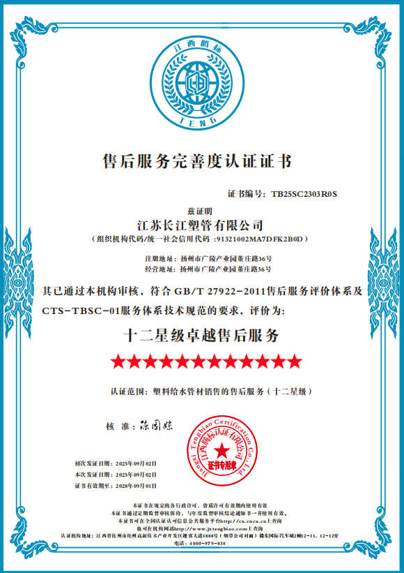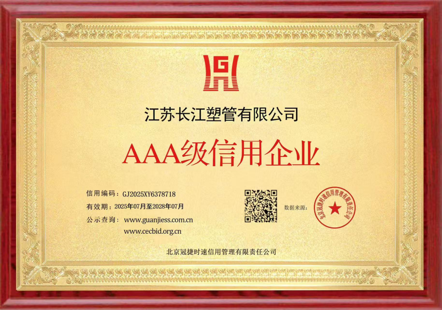 2025年,江苏长江塑管有限公司接连荣获AAA级信用企业蝉联认证与十二星级卓越售后服务评价。这两项沉甸甸的荣誉,不仅是国家权威机构的高度认可,更是企业全体员工在生产一线以汗水与担当书写的奋斗答卷。