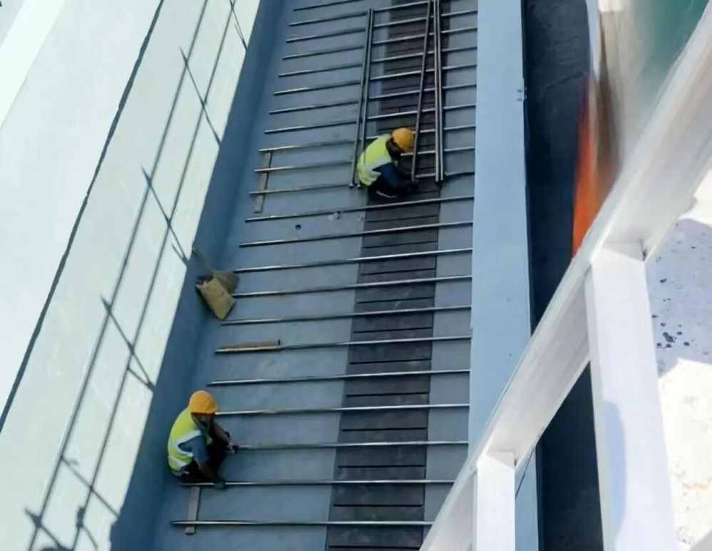 在生物反应池作业面上,正在进行火烧板贴面安装的黄师傅是众多坚守者中的一员。黄师傅说“为了抢进度,除了中秋节下午放了半天假,整个假期我们都在工地上”。工地每天清晨5点半开始运转,施工人员到岗后首先参加安全例会和班前教育,明确当日任务后,便立即投入紧张作业。这份坚守,不仅体现了建设者对岗位的尽责,更寄托着对项目早日建成投运的期盼。