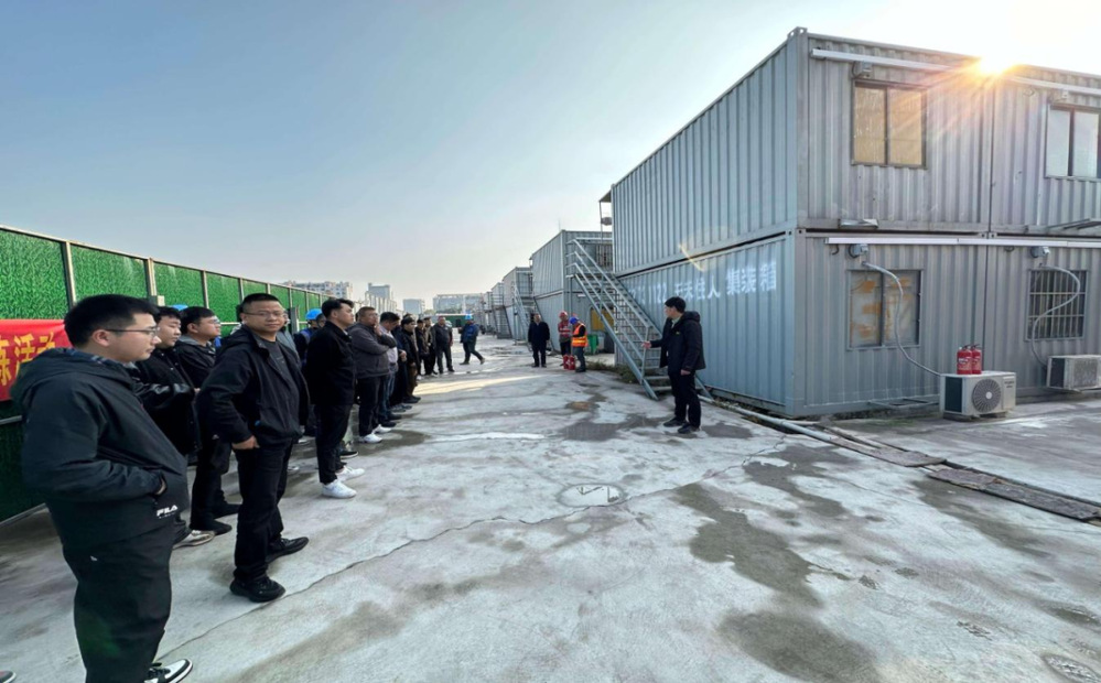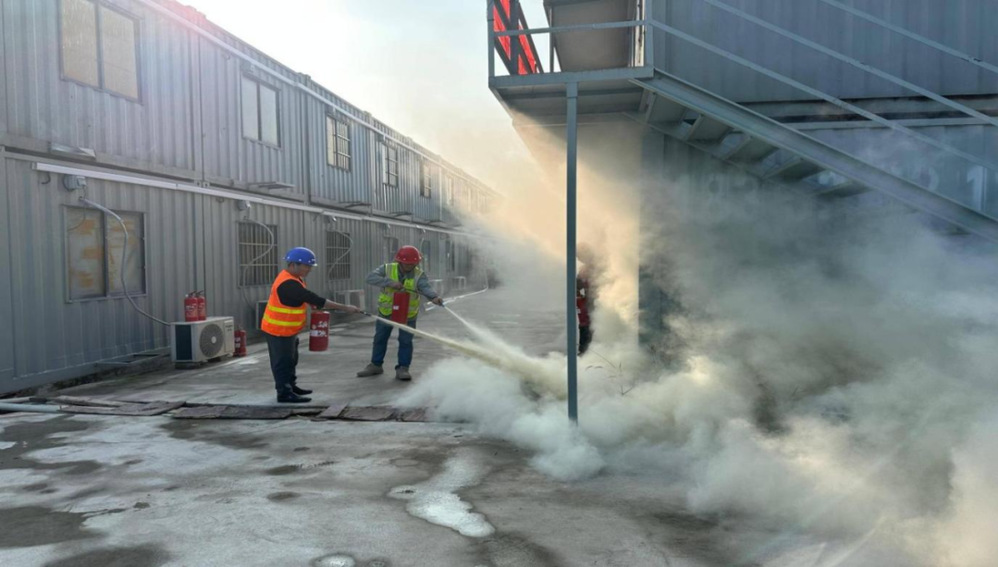 本次培训邀请消防安全专家进行授课。演练前,专家详细讲解了火灾报警流程、初期火灾扑救技巧、疏散逃生注意事项等核心知识,重点演示了灭火器“提、拔、握、压”的正确操作方法,同时明确了疏散引导员、灭火行动组的职责分工,划定了安全疏散路线和集合区域。下午2时30分,演练正式启动。模拟火情信号发出后,集装箱板房内烟雾弥漫,现场立即启动应急响应预案。疏散引导员迅速组织员工用湿毛巾捂住口鼻,弯腰低姿沿预定路线快速、有序撤离至指定安全区域;灭火行动组携带灭火器、消防水带等器材,第一时间赶赴“火情”现场,对着火点实施精准扑救。