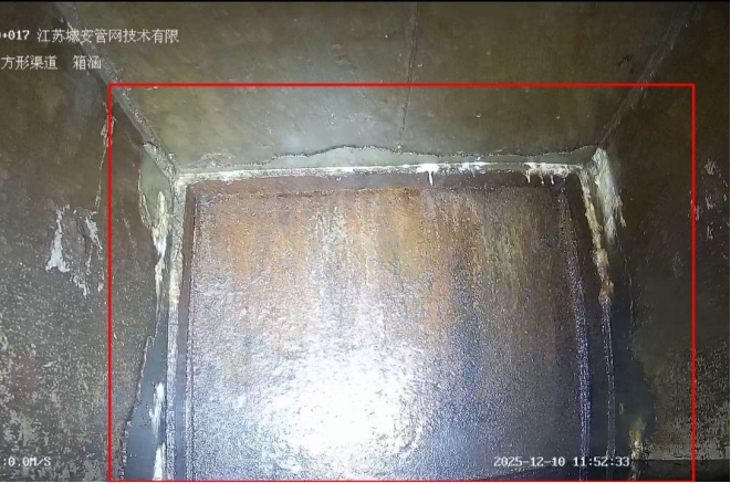 本次作业中,搭载高清球机摄像头的全地形机器人发挥显著优势。在无需预处理的情况下,凭借强劲动力与复杂环境适应能力,机器人在高水位箱涵内灵活行进,实时回传高清影像,精准捕捉涵壁破裂、脱落、渗漏等病害。针对箱涵内满水区域,技术人员运用动力声呐检测机器人,通过声波扫描生成二维轮廓图,清晰呈现水下结构状态与淤积情况,有效弥补视觉盲区,实现水面上下无缝衔接的全覆盖检测。通过视频影像与声呐数据的快速融合分析,技术团队精准定位隐患,并针对性提出维护建议,为后续隐患治理提供了可靠依据。