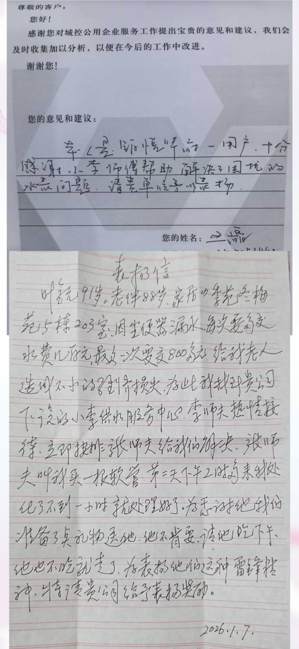 2025年12月10日下午及2026年1月7日,长江水务小李服务队队长李青同志及队员,在文汇东路服务大厅先后收到两位用户的高度赞扬。用户对服务队专业高效、热情周到的服务给予了诚挚肯定。