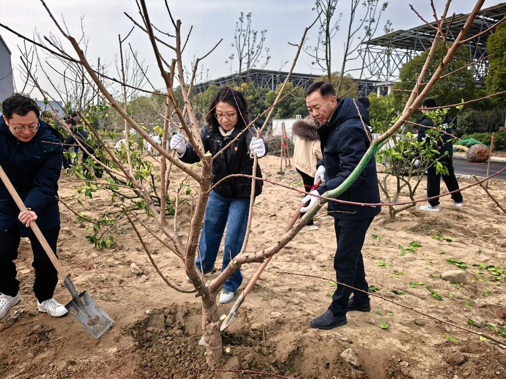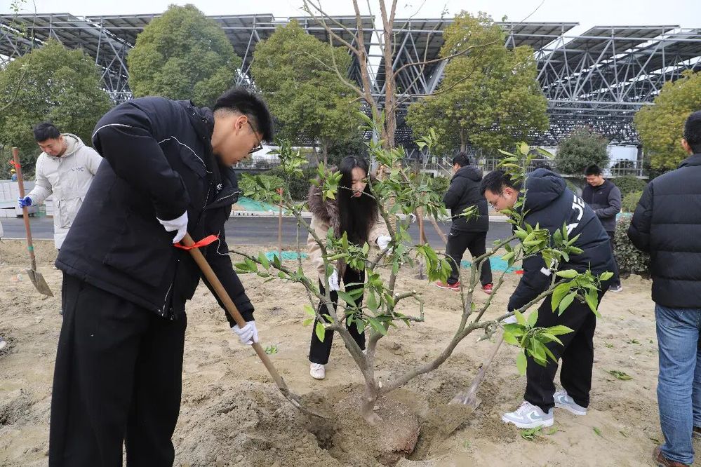 随后,工作人员详细讲解了苗木种植要点、现场安全注意事项及分组安排,在领取铁锹、水桶、手套等工具后,大家迅速投入植树作业,扶苗、填土、压实、浇水,每一个环节大家都配合默契、一丝不苟,保证每一棵桃树苗都能规范栽种、落地生根,36棵苗木很快在六圩污水处理厂的土地上整齐挺立,为厂区增添了一抹盎然春意。