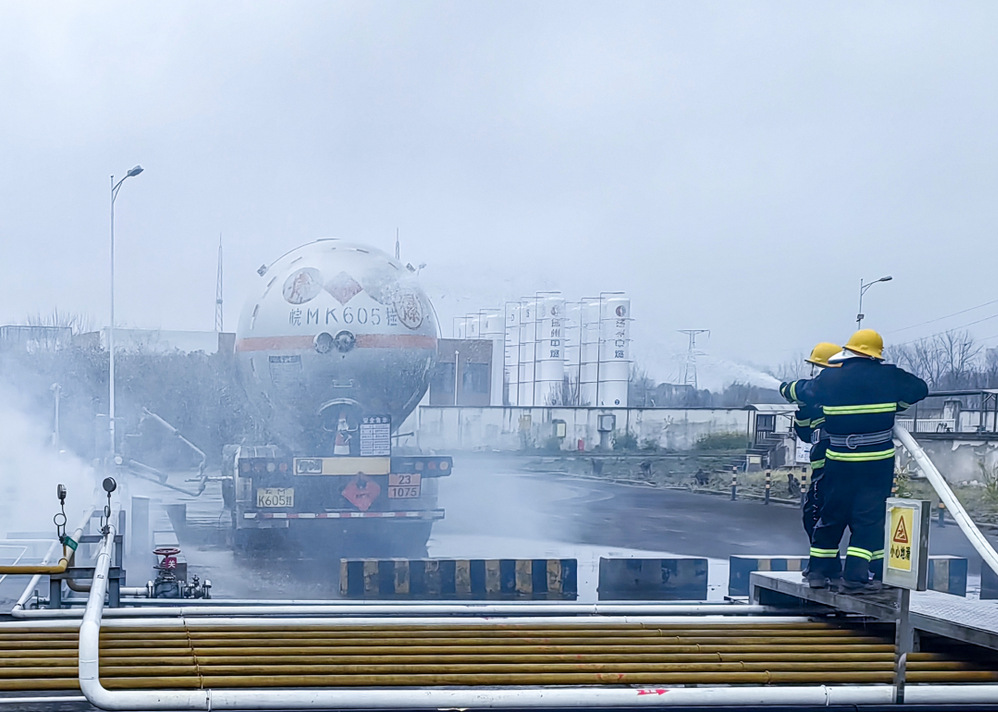 本次演练模拟液化气槽罐车卸气过程中突发泄漏应急处置:卸车操作工发现鹤管接口泄漏后,立即通知押运员关闭车载紧急切断阀,卸车工关停压缩机,充装人员同步停止作业并关闭相关阀门。安保人员迅速设置警戒线,严禁无关人员进入;现场启用雾状水稀释泄漏区域液化气浓度,待浓度降至安全范围后,维修人员更换损坏密封圈,并用可燃气体检漏仪复检确认无隐患,随后恢复充装卸车作业。