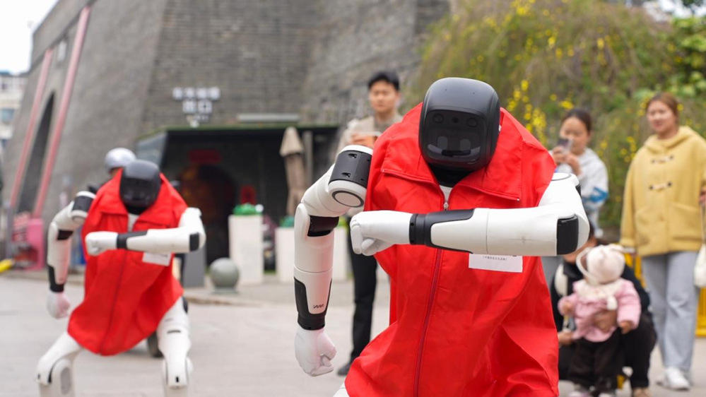 活动现场,机器人与游客的亲密互动成为最大亮点。人形机器人轮番献上欢快的歌舞表演,利落的舞姿、悦耳的歌声,瞬间点燃现场氛围;机器狗则大展身手,流畅完成前后空翻等酷炫动作,惊艳的姿态出彩全场,引得过往游客纷纷驻足围观、拍照打卡,现场欢呼声、喝彩声不断。