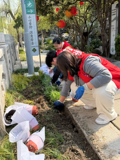 活动现场,志愿服务队牵头,街区运营团队、物业工作人员分工协作、配合默契,在街区沿河步道等区域修剪杂枝、翻松土壤、清除杂草,针对部分空置区域,适量补植花灌木与时令花卉,大家仔细做好挖坑、扶苗、培土、浇水等工序,确保“栽一片、活一片、美一片”。此次志愿行动也带动了周边商户和市民主动参与,大家主动搭把手、出分力,在点滴行动中进一步增强了爱绿、护绿、共建美丽小秦淮的意识。