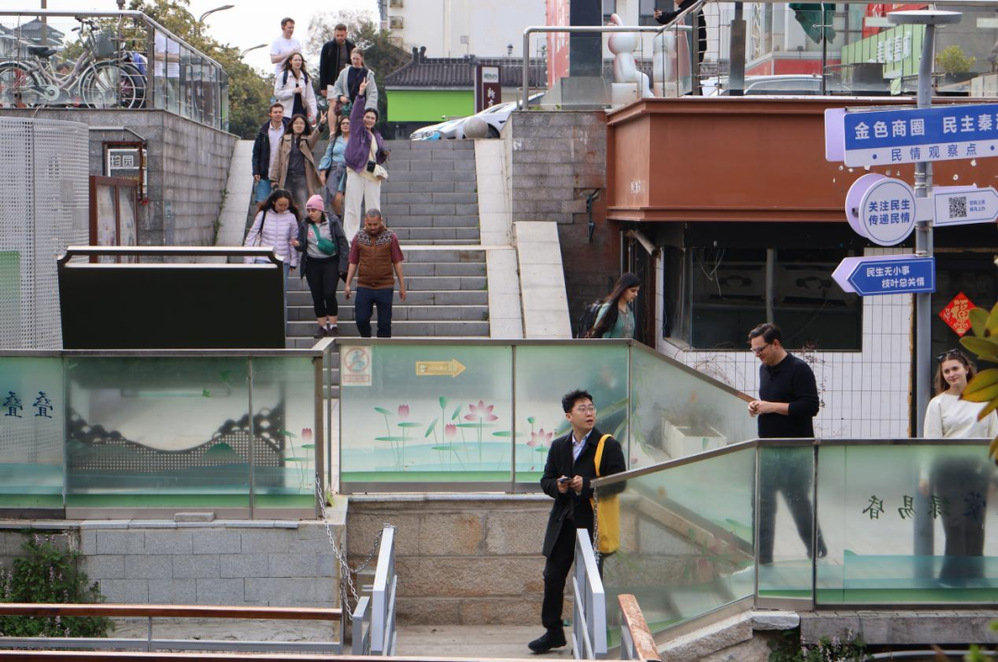 曼彻斯特大学师生在古保公司相关负责人带领下依次观摩了小秦淮街区展厅的常设展览,参观了街区的滨水步道、节点的内部空间改造及多样化业态,通过实景沉浸式感受小秦淮街区的发展活力与历史人文底蕴,客观的了解了扬州城市更新实践范本。