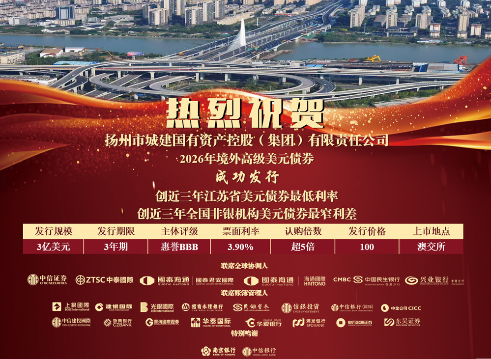 4月16日,城控集团成功发行3亿美元境外高级债券,期限3年,票面利率3.90%。本次发行前期通过境外路演充分夯实了发行基础,获得了境外投资者超5倍发行规模的踊跃认购,收获了来自香港、首尔、伦敦等地区的大量市场化订单,为本次债券顺利发行提供了有力支撑。本次发行刷新江苏省近三年美元债券最低利率,同时也刷新了近三年全国非银机构美元债券与同期限美国国债最窄利差。本次发行充分展现了资本市场对城控集团信用资质、综合实力与发展前景的认可。